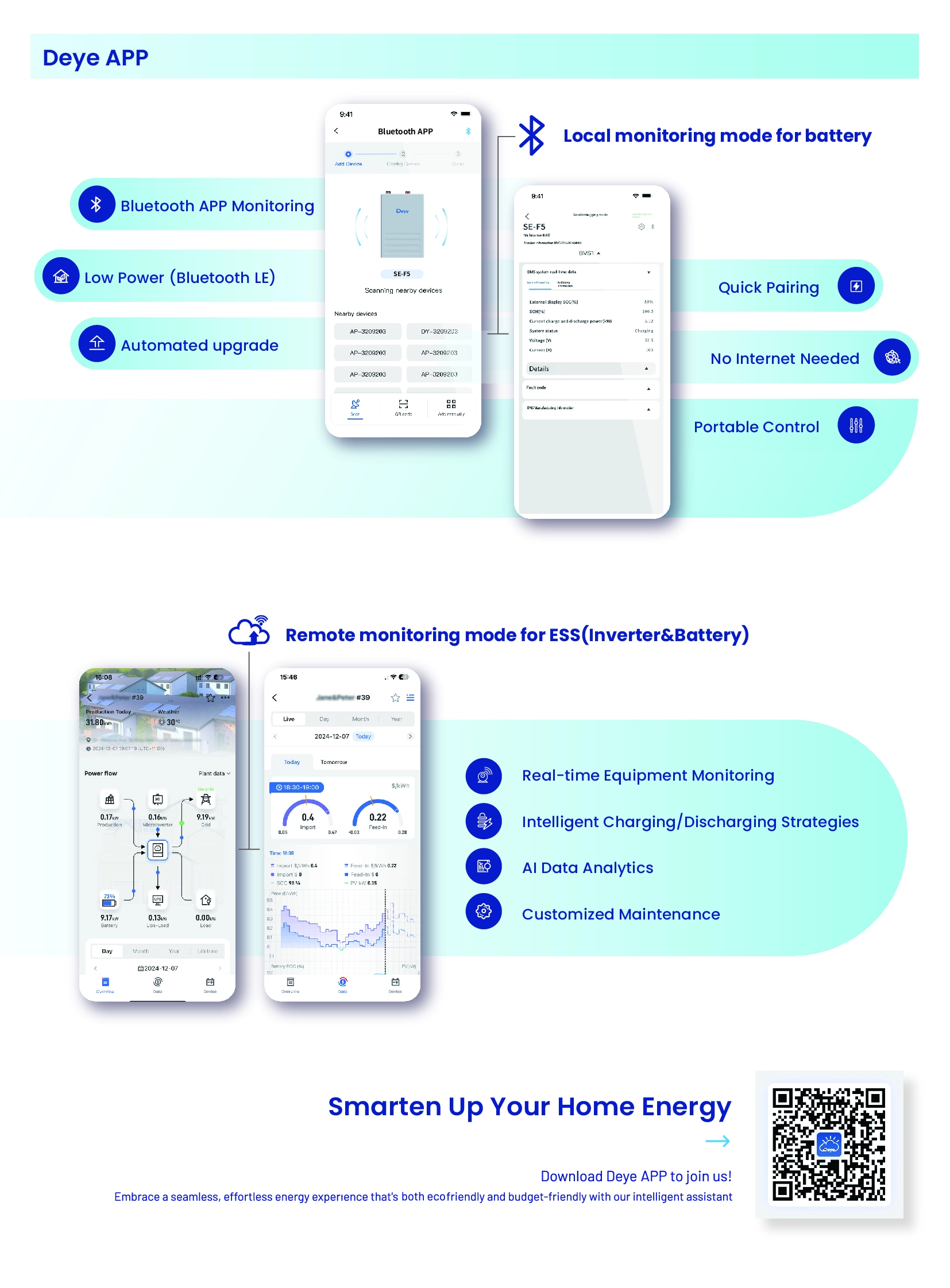 Kết nối linh hoạt – RS‑485 & CAN cho BMS/EMS, Bluetooth hỗ trợ giám sát và cấu hình qua ứng dụng Deye Smart ESS.